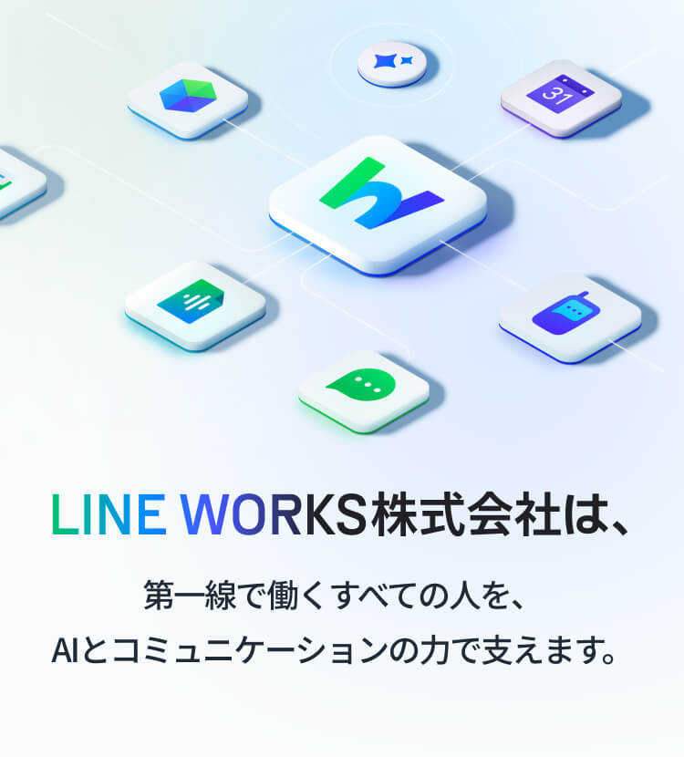 Top Page Pick up LINE WORKS株式会社は10周年を迎えました。 こちらから 製品一覧 LINE WORKS株式会社の最新情報 お知らせ もっと見る 2025.08.08LINE WORKS AiCall 【9月4日(木)開催】Contact Center AI Summit 〜20社のAI活用事例から見えるCX・EXの新戦略〜登壇のお知らせ 2025.08.06リリース [LINE WORKS AiNote] アップデートのお知らせ (2025年8月7日) 2025.08.04リリース [LINE WORKS] アップデートのお知らせ (2025年8月6日) 2025.08.01サービス 共有文字起こし時間およびAI要約の更新に関する不具合のご報告 2025.07.28リリース [LINE WORKS] アプリディレクトリ「日程調整(β版)」提供開始のお知らせ LINE WORKS株式会社は ユーザーに最良のITサービスを提供するため 日々、改善を続けています。 MISSION その日から、 はたらき方が変わるアイデアを その日から、 つかえるカタチで次々と。 その日から、はたらき方が変わるアイデアをその日から、つかえるカタチで次々と。わたしたちのテクノロジーは、創るだけでは完成しない。はたらくすべての人の役に立ってはじめて、できあがる。だから今日も、はたらく人の現場へ通う。一人ひとりと話を重ねる。あたらしい「はたらく」を想像し、課題をみつけ、ひとつずつ答えを創る。小さな、けれど毎日の悩みから解放し、大きなやりがいを生みだすために。テクノロジーを、すべての「はたらく」にかけがえのないものにするために。わたしたちは、はたらく人のいちばん身近で、いちばんやさしい味方でいたい。 わたしたちのテクノロジーは、創るだけでは完成しない。はたらくすべての人の役に立ってはじめて、できあがる。だから今日も、はたらく人の現場へ通う。一人ひとりと話を重ねる。あたらしい「はたらく」を想像し、課題をみつけ、ひとつずつ答えを創る。小さな、けれど毎日の悩みから解放し、大きなやりがいを生みだすために。テクノロジーを、すべての「はたらく」にかけがえのないものにするために。わたしたちは、はたらく人のいちばん身近で、いちばんやさしい味方でいたい。 VISION すべての「はたらく」の毎日を、 ひとつずつ明るくする。驚くほどに。 すべての「はたらく」の毎日を、ひとつずつ明るくする。驚くほどに。 VALUE Discuss All Try All Quest All わかりあえるまで、話し合う。あなたのフレンドリーさが、相手のニーズをひきだしてくれる。相手のことを決めつけずに想像する謙虚さが、自分にできることを見つけてくれる。やれることは、全部やる。「はたらく」を良くするために、できること。見つけたら、思いついたら、できるだけ全部やろう。まわりも仲間にして、やりきろう。未知を、楽しむ。いつもと違う道を歩く。いつもと違う人と話す。いつもと違う仕事をする。その先にはきっと、新しい発見やチャンスが待っている。 Discuss All わかりあえるまで、話し合う。 あなたのフレンドリーさが、 相手のニーズをひきだしてくれる。 相手のことを決めつけずに想像する謙虚さが、 自分にできることを見つけてくれる。 Try All やれることは、全部やる。 「はたらく」を良くするために、できること。 見つけたら、思いついたら、 できるだけ全部やろう。 まわりも仲間にして、やりきろう。 Quest All 未知を、楽しむ。 いつもと違う道を歩く。 いつもと違う人と話す。いつもと違う仕事をする。 その先にはきっと、 新しい発見やチャンスが待っている。