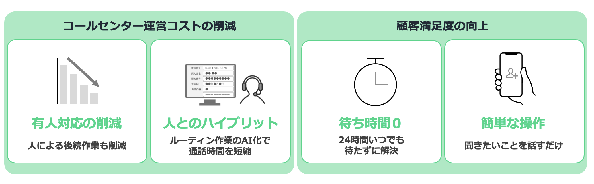 顧客がコールセンターに求めている「問い合わせに対して、迅速かつ簡単に繋がり問題を解決すること」こちらもAIによる対応でスムーズなご案内が可能となり顧客満足度の向上に繋がります。