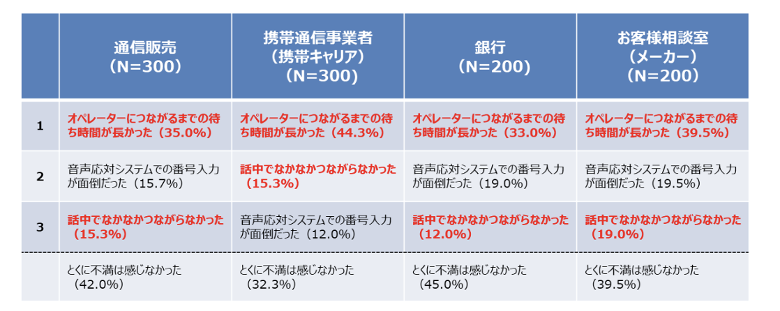 前述のとおりお客様がコールセンターに求めているものは「お問い合わせに対して、迅速かつ簡単に繋がり問題を解決すること」とコールセンタに対する不満を調査したアンケート結果でわかります。
