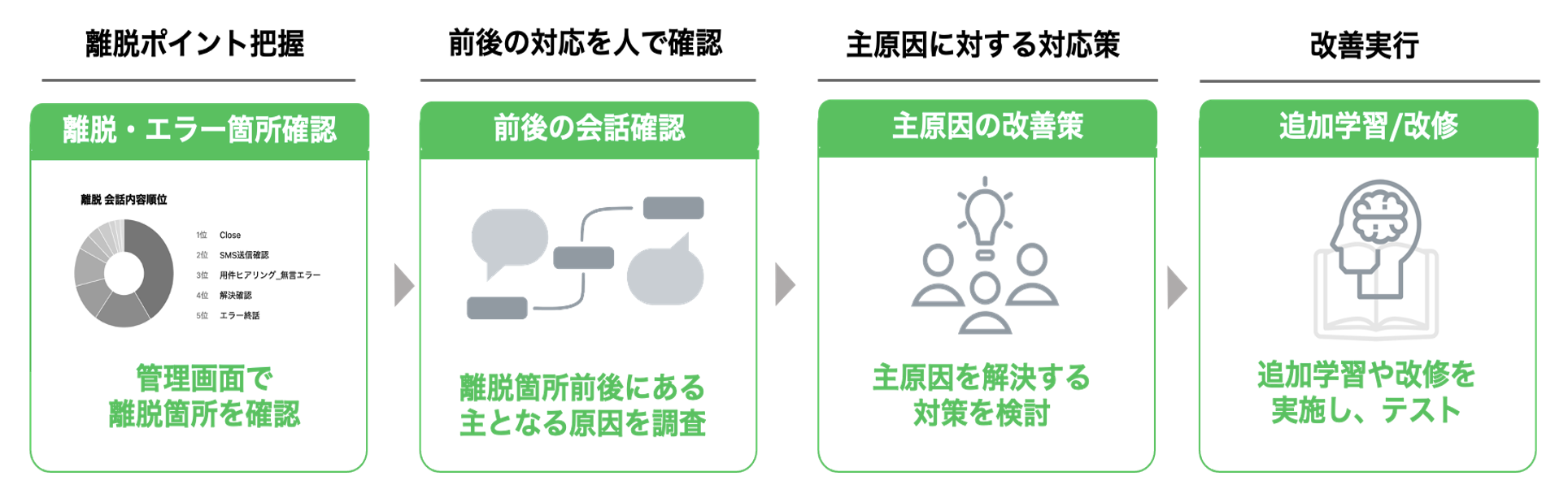 また自然言語処理も、離脱前後の対話を確認し、エラー原因の改善学習をおこない、精度向上に取り組みます。