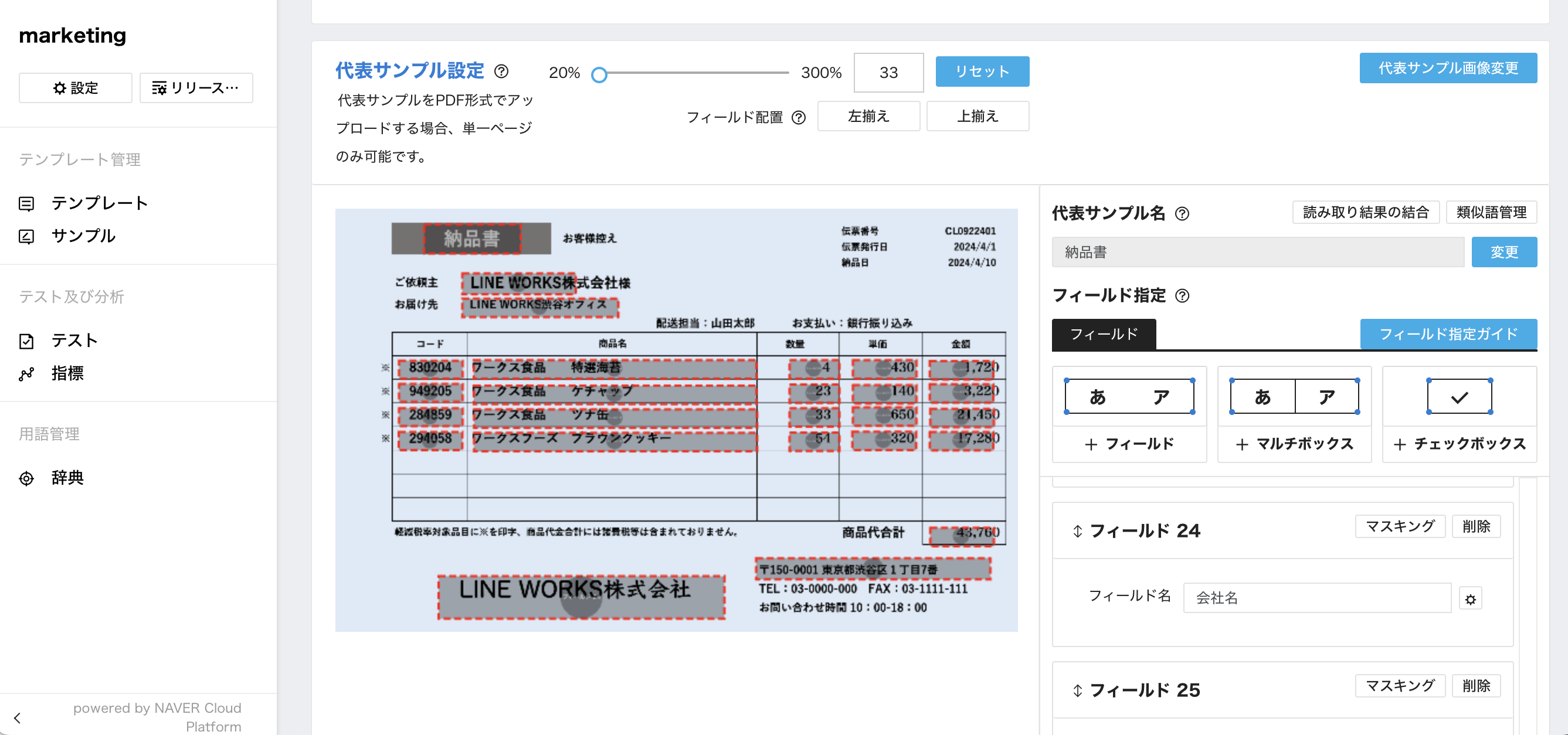 LINE WORKS OCRの「Templete OCR(定形OCR)」は、事前に登録した帳票のレイアウトに沿って、対象の文字のみをテキストデータ化するOCRです。