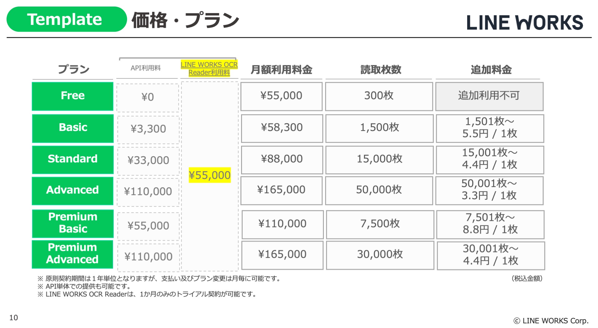 LINE WORKS OCR・Templateプランの利用料金