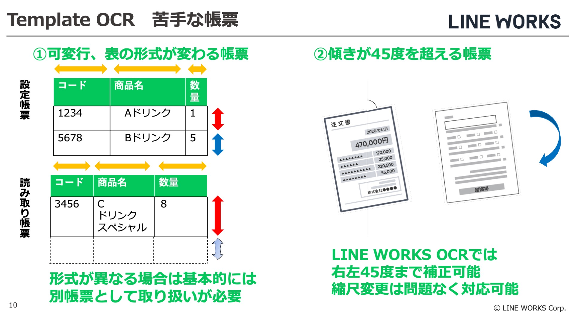 LINE WORKS OCR・Templateプランは、表の形式が変わる帳表の読み取りが苦手です。行数が変わる物、セルの大きさが変わる物等、Templateで対応できないものが該当します。もし帳表の形式が異なる場合は、基本的に別帳表として取り扱いが必要です。