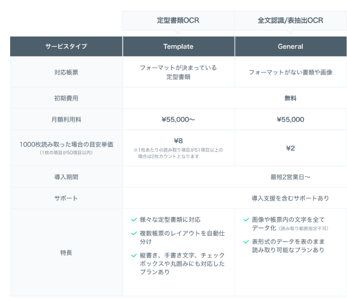 基本料金は月額55,000円からで、1枚50項目以内の書類を1,000枚読み取ったときの目安単価は、1枚2〜8円程度と安価です。 ※ APIのみ利用の場合は月額3,300円~
