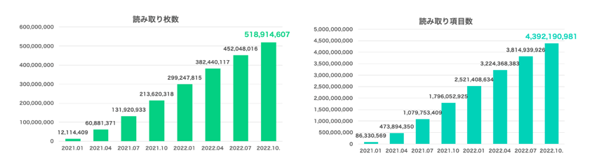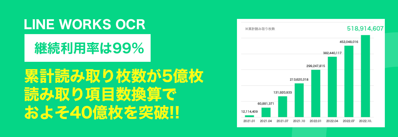 あらゆる書類や画像に記載された文字等の情報を、項目の自動分析・仕分けを行った上で※データ変換するDocument AIサービス「LINE WORKS OCR」は、販売開始以降、お客さまに利用いただいた累計読み取り枚数が5億枚、項目数に換算しおよそ40億項目以上を突破いたしました!(2022年10月末時点)