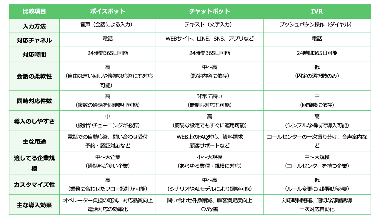 短期間・低コストで導入したい場合はIVRやシンプルなチャットボットが向いており、長期的な業務改善にはボイスボットの導入が効果的です