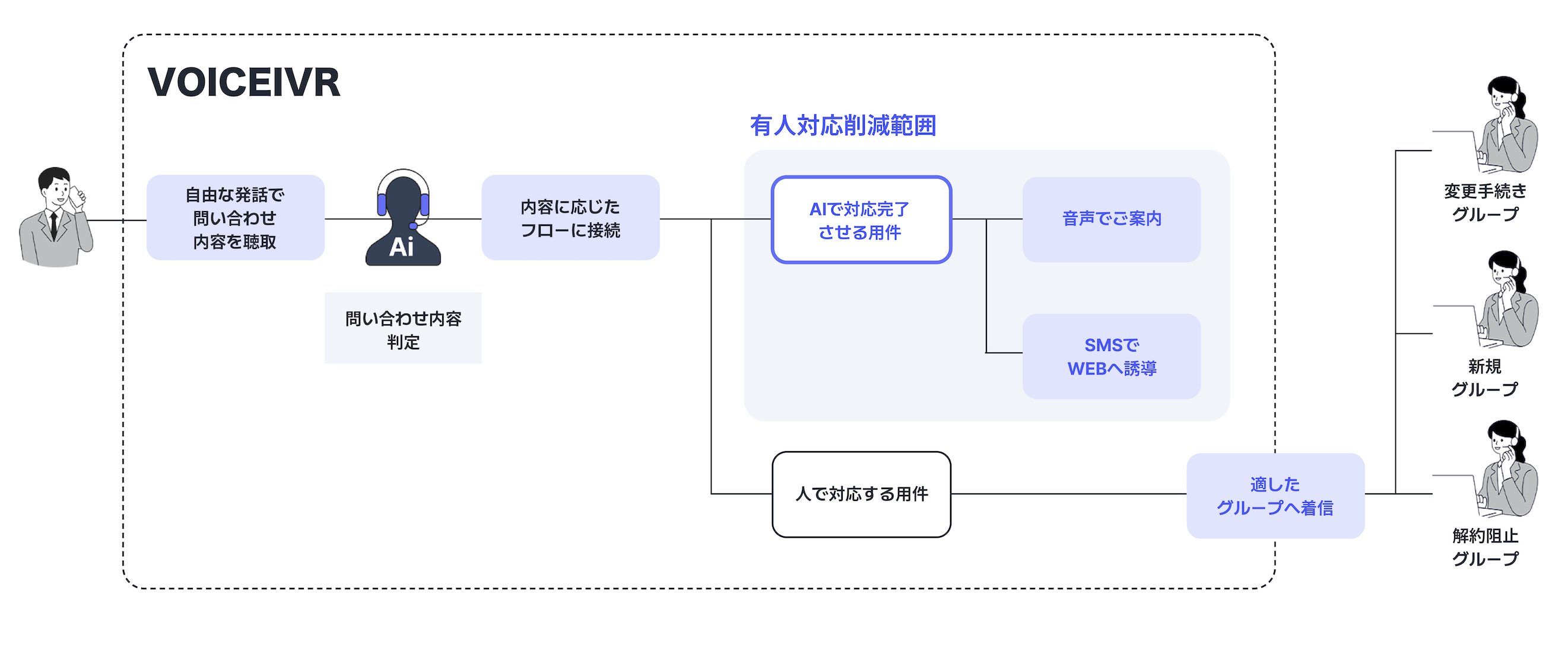 VOICEIVRはお客様が電話のお問い合わせで自由に発話された内容をAIが認識し 「AIで完結できるもの」と「有人対応が必要なもの」を自動で振り分けます。