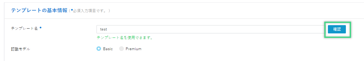 テンプレート名を設定し、契約頂いたサービスモデルを選択後、「確認」をクリックします。