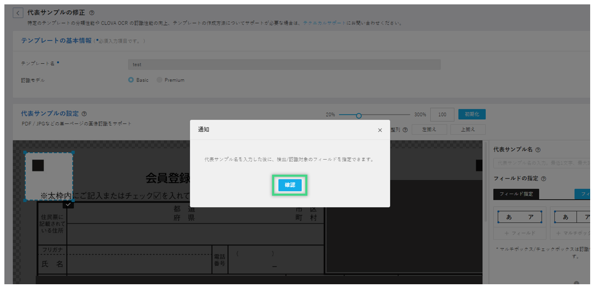 代表サンプル名を入力し、「確認」をクリックします。