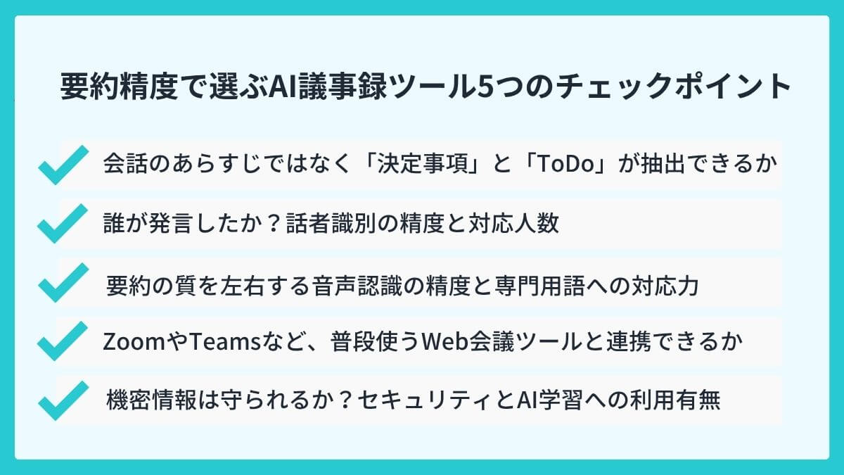 要約精度で選ぶAI議事録ツール5つのチェックポイント