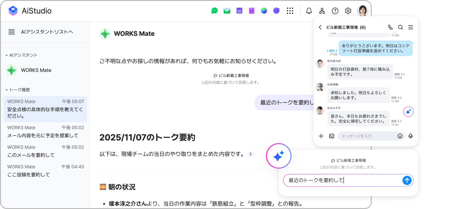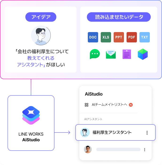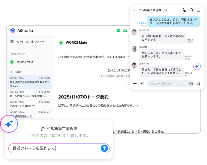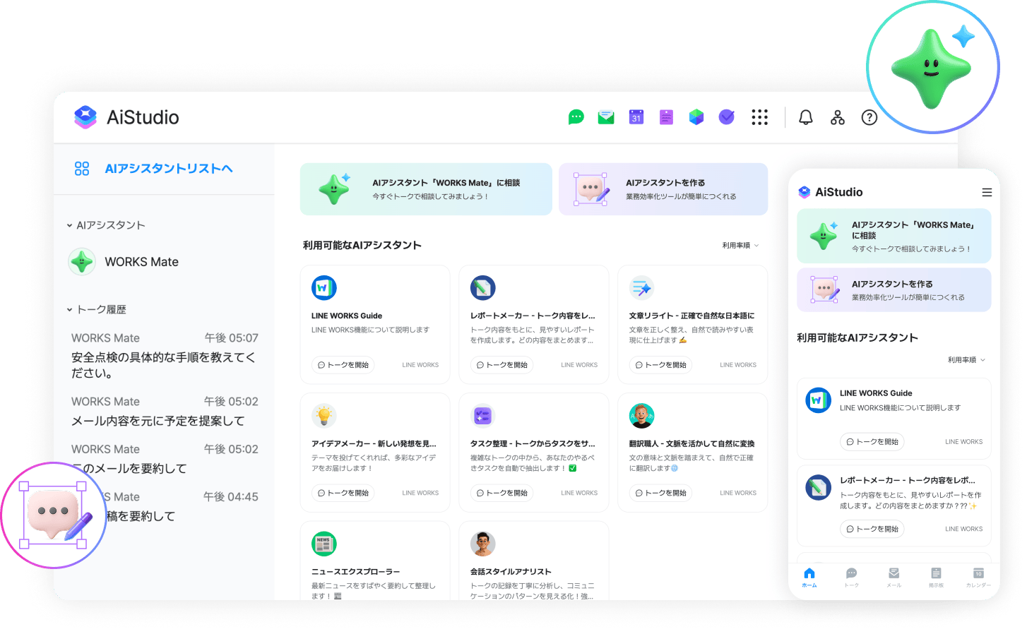 また、LINE WORKSアプリ上からもAIアシスタントを呼び出せるなど、AiStudioと組み合わせたさまざまなAI機能を利用できます。