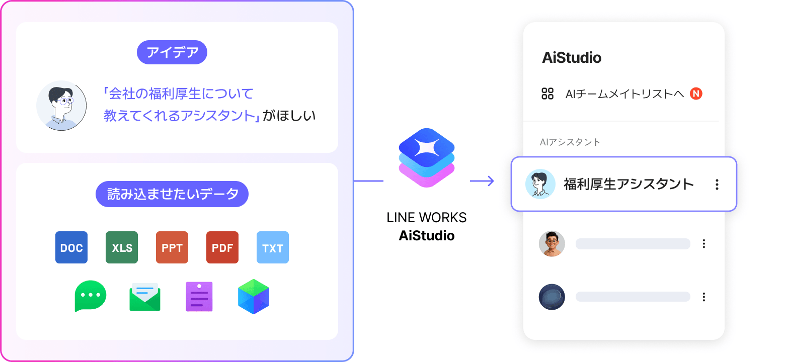 汎用的に相談できるAIアシスタントや、役割に特化したAIアシスタントたちが、それぞれのシーンで仕事を支援します。