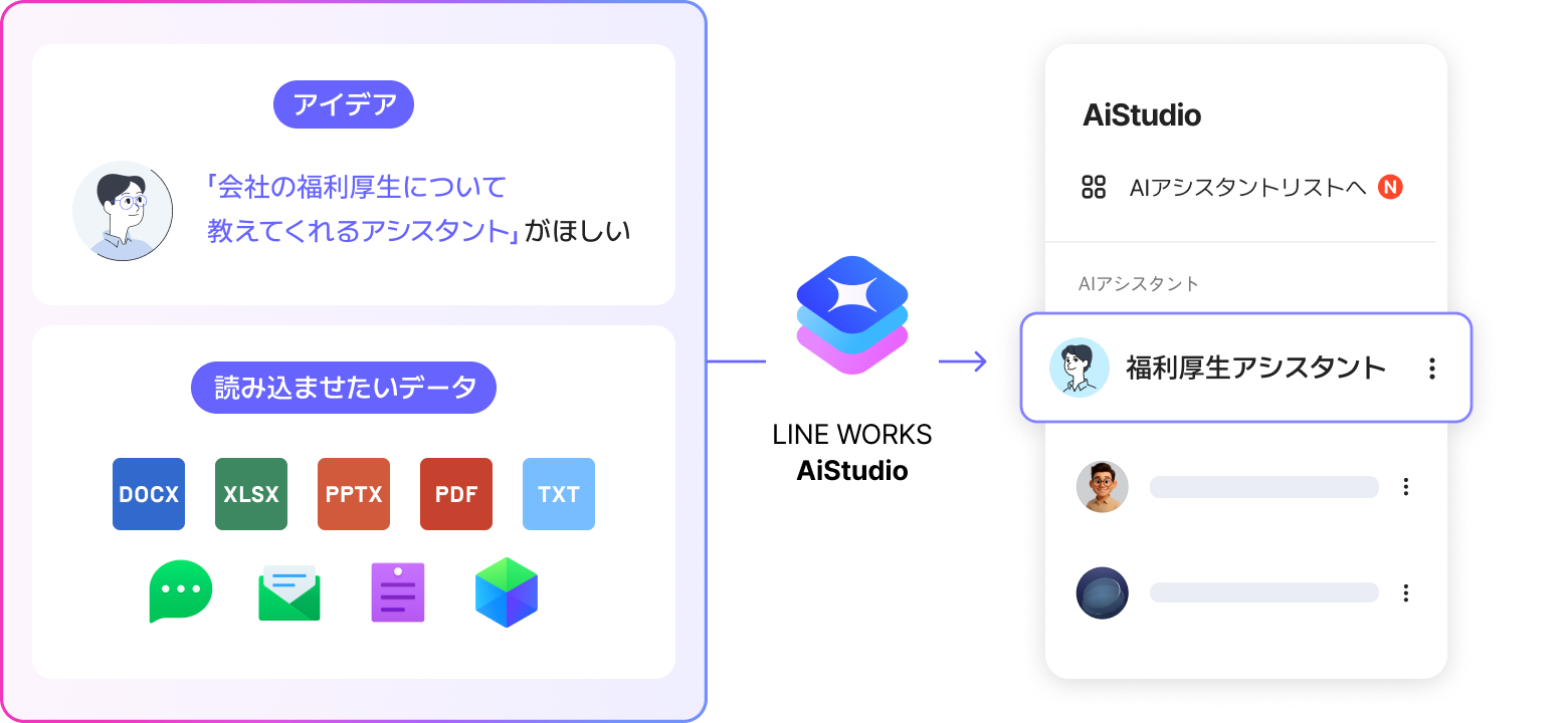 Retrieval-Augmented Generation (検索拡張生成) のことです。社内のマニュアルや資料を読み込ませることで、その内容を元に回答してくれるAIアシスタントを作ることができます。 AiStudioは、LINE WORKSの技術力を駆使し、データの前処理の手間などを軽減させ、簡単に利用できる仕組みを提供しています。