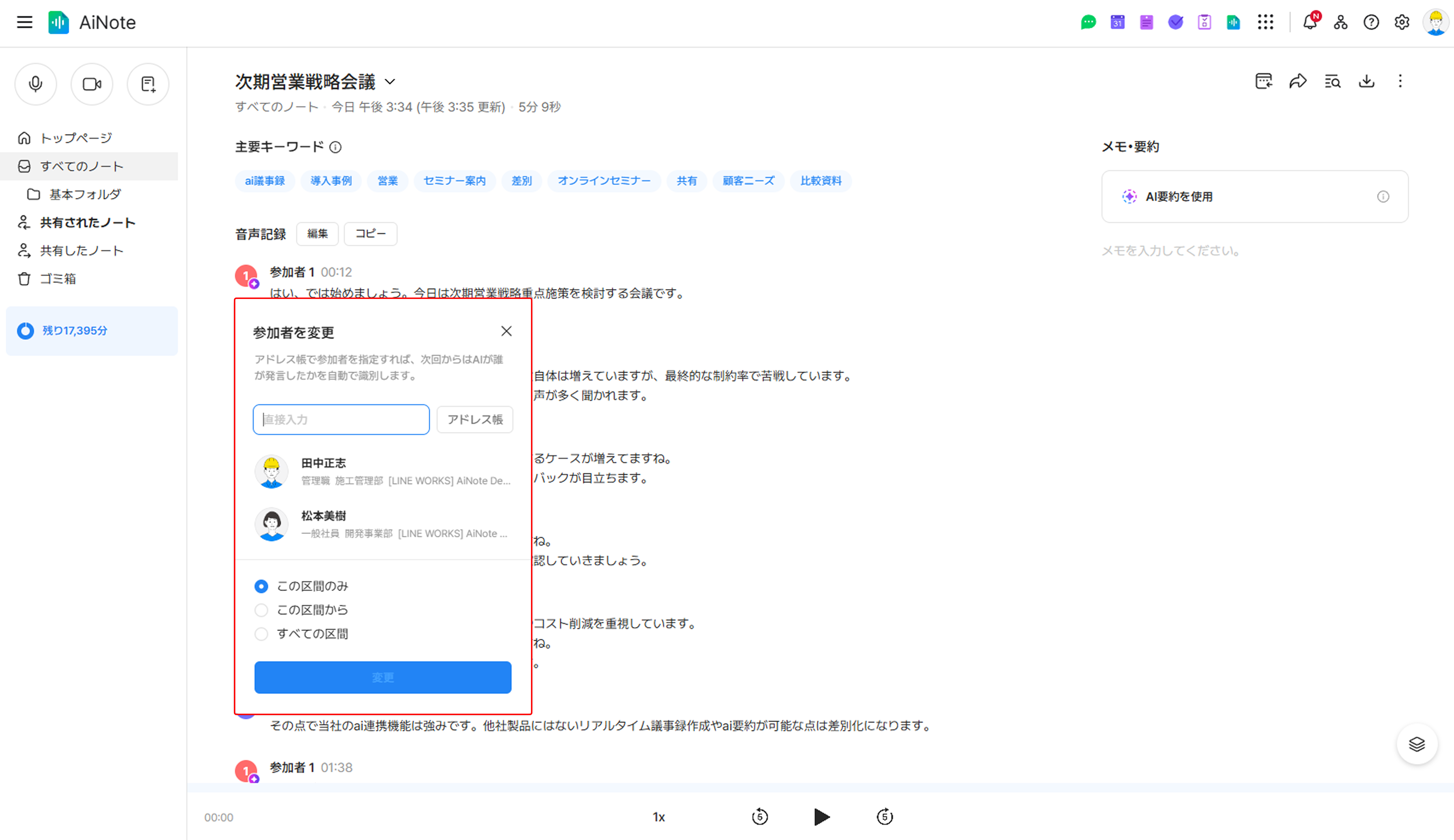使い方は簡単。各発言の参加者にアドレス帳のメンバーを指定すると、次回の録音からはAIが自動で話者を識別してくれます。