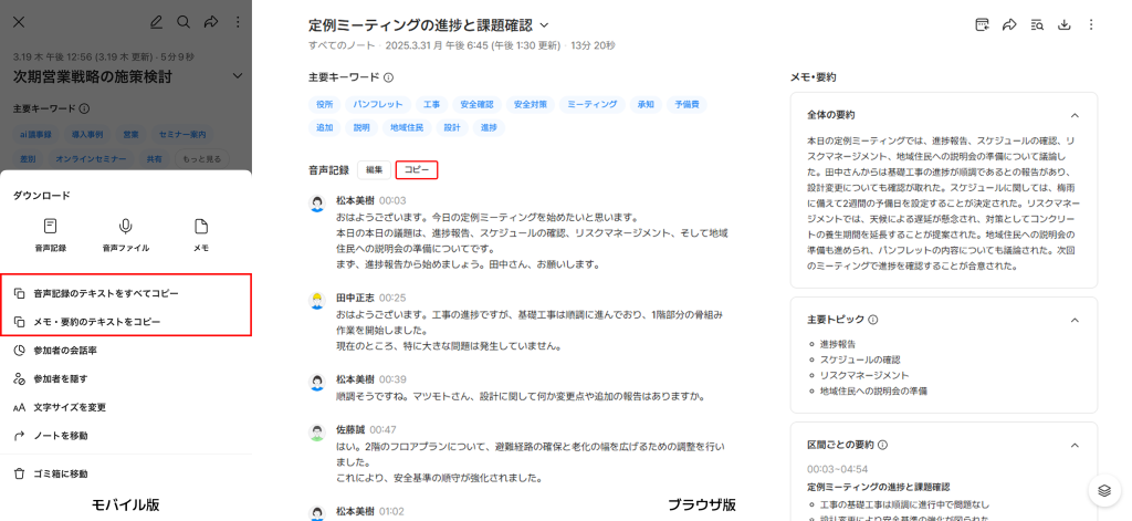 モバイル版では「すべての音声記録・テキストをコピー」「メモ・要約テキストをコピー」メニューを追加。