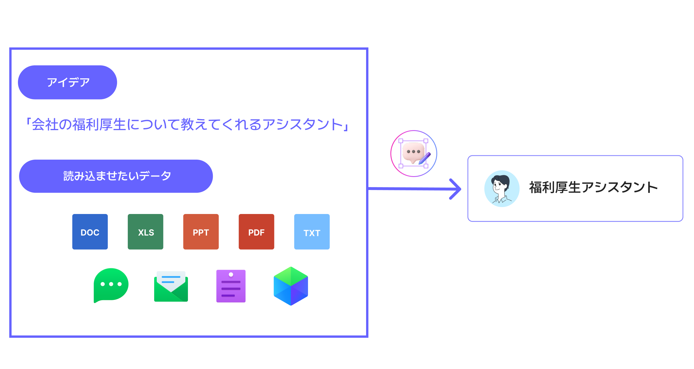 例えば、会社の福利厚生について教えてくれるAIアシスタントを作る場合は、そのアイデアと、福利厚生についてまとまった文書データを読み込ませて素早く作成することができます。