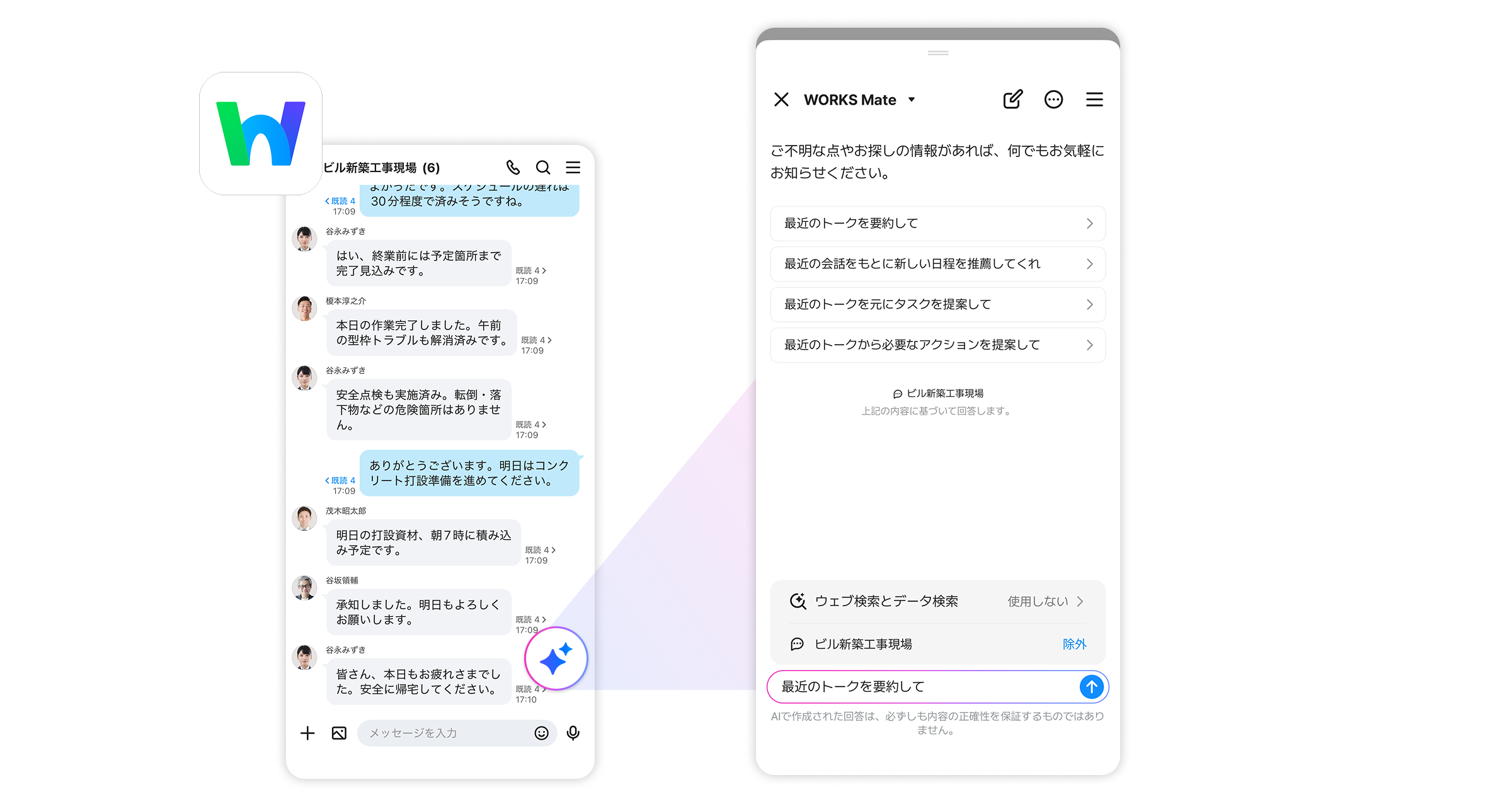 トークや掲示板の投稿内容などを AIアシスタント が参照し、必要な情報を瞬時に整理・提案してくれます。