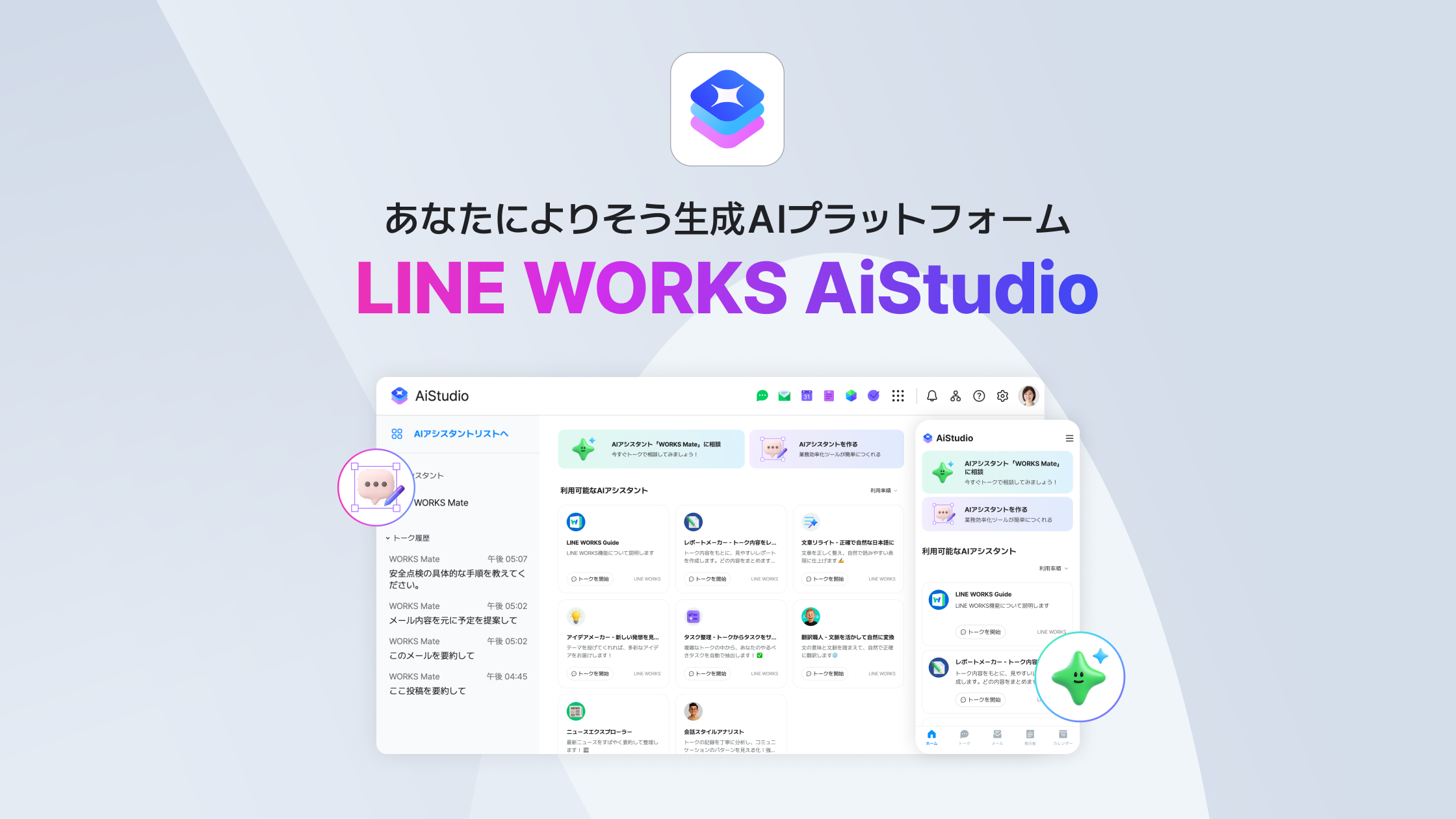 BLOG LINE WORKSチームがお届けする情報ブログです。 すべて 活用事例 連携ツール 機能紹介 イベント 会社情報 ビジネスチャット 働き方改革 Menu すべて 活用事例 連携ツール 機能紹介 イベント 会社情報 ビジネスチャット 働き方改革 aistudio AiStudio AiStudio 活用ガイド AIアシスタントと会話してみよう – AiStudio活用ガイド 「LINE WORKS AiStudio」は、専門知識がなくても自社の業務やデータに合わせてAIアシスタントを活用できる、生成AIサービス &am 2025.12.12 AiStudio 生成AIを業務に活用!LINE WORKS AiStudio提供開始! ・社内の資料やナレッジを探すのに時間がかかる… ・日々の報告書やメール作成に追われている… ・生成AIを業務 2025.11.27 もっと見る 2 2