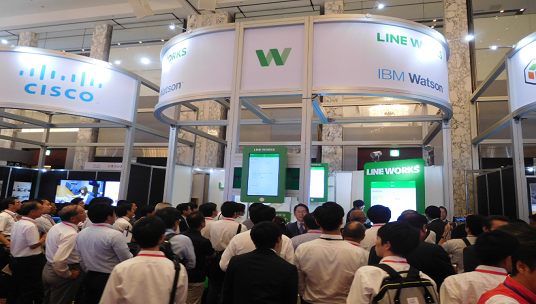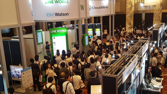 さて、弊社の「LINE WORKS」のブースについてですが、「働き方改革」や「AI」をテーマに、オープンセミナー形式でサービスをご紹介しました。