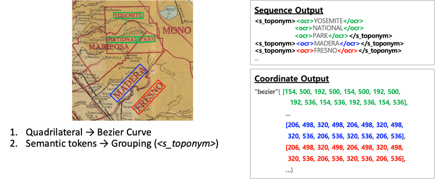 ・地名グループ化用の特殊トークン<s_toponym>の導入:離れた文字列をひとつの地名としてまとめることを可能にし、図3の「YOSEMITE NATIONAL PARK」などの正確なグルーピングを実現