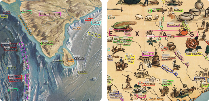 本コンペティションでは、図1のように歴史的な地図画像から地名・地形名・水域名などを自動的に認識することが求められます。従来のOCR(Optical Character Recognition)の手法では、 曲線の文字、 オーバーラップ(文字の重なり)、回転・スケールの変化などの対応が難しく、精度向上が課題でした。さらに、単なる文字認識にとどまらず、離れた位置にある文字群をひとつの地名として正しくグルーピングする必要がある点でも、非常に高度なタスクです。