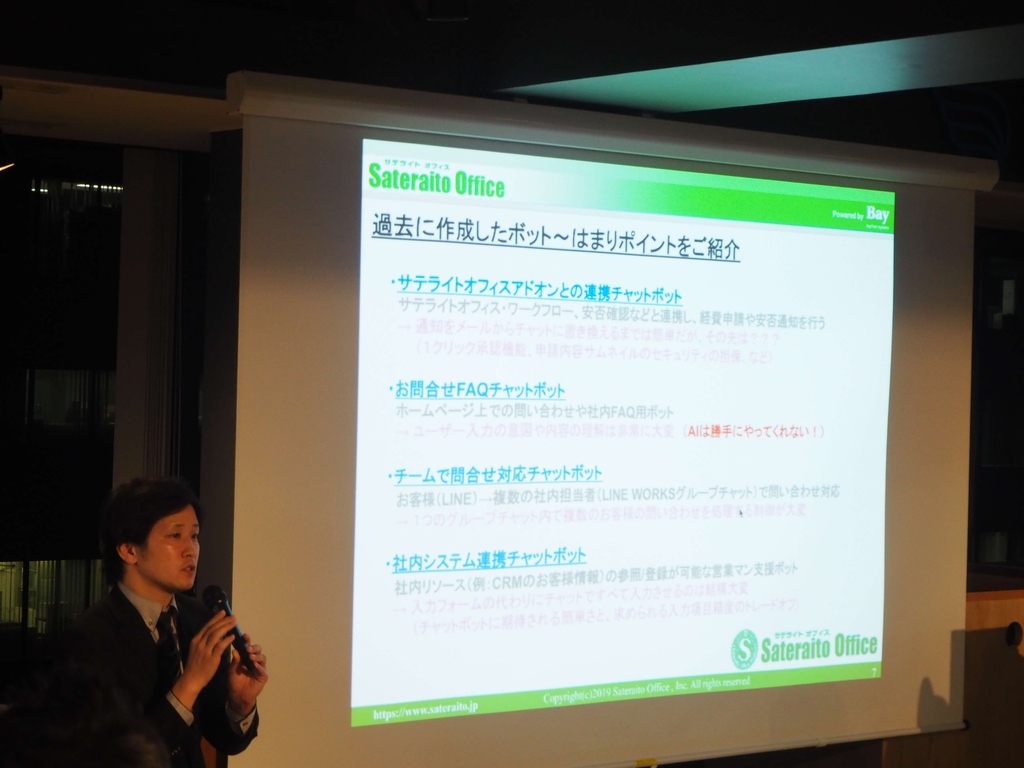 →トークで会議室の予約ができたり、アンケートの結果が答えられると便利そうということでしたが、現在APIがまだ公開されていない部分も多いため、今後充実させていきたいと思います。
