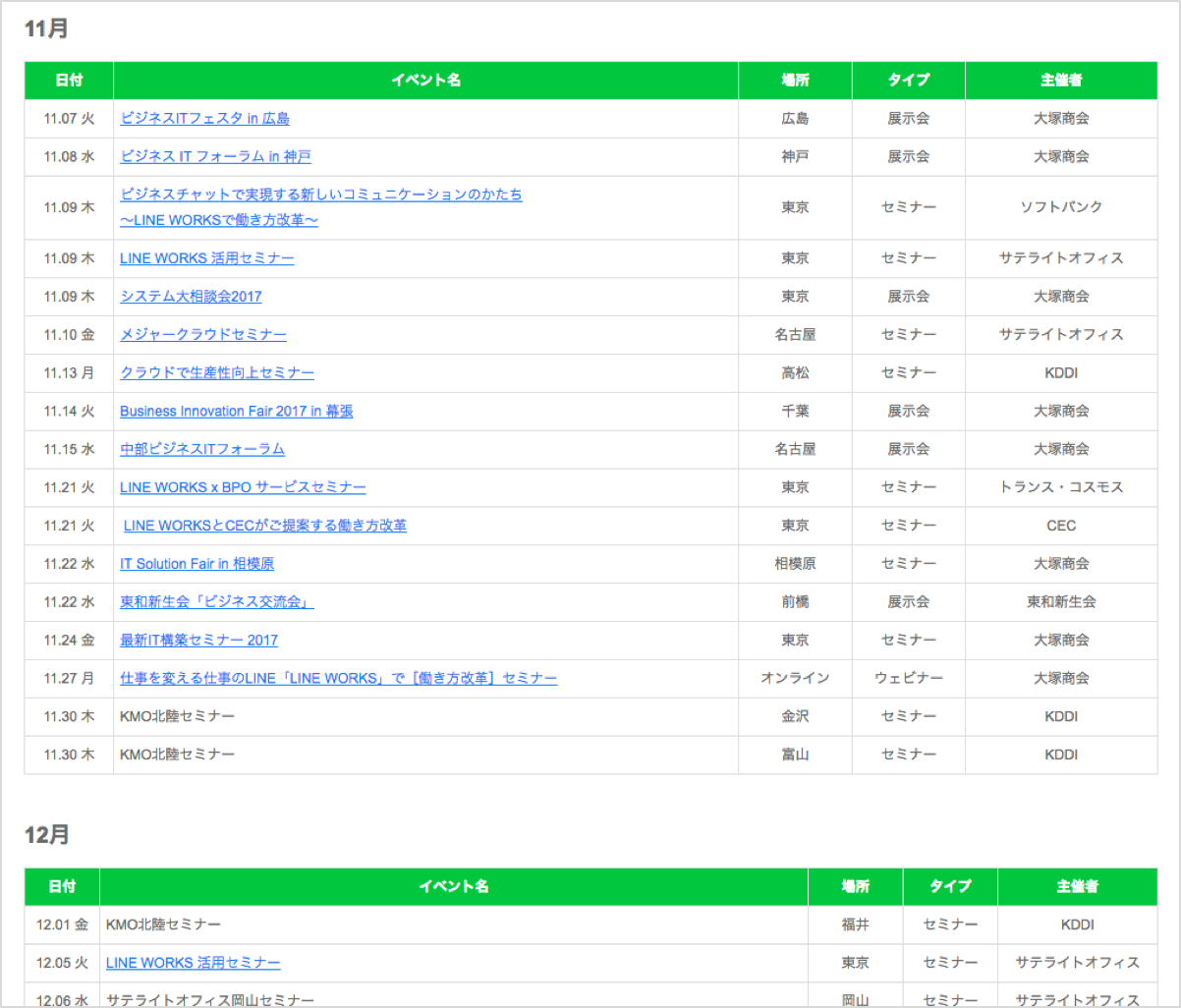 このように、LINE WORKSに関連するセミナーや展示会の情報を時系列でご確認いただけるページです。イベント名がリンクになっている場合は、イベントの詳細/申込ページにすぐにアクセスいただけます。
