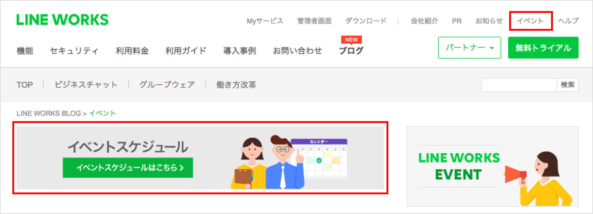 このページには、LINE WORKS 公式サイトのイベントページ(メニューバーからアクセス!)内にある「イベントスケジュール」バナーからアクセスいただけます。