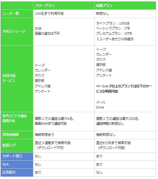 ライトプラン(月額ひとりあたり¥300〜)と同様に、トーク(ノート/予定/フォルダ)、音声・ビデオ通話・画面共有、カレンダー、タスク、ホーム(掲示板)、アンケート、アドレス帳(組織サポート)、管理とセキュリティ、監視ログが無料で使えます。