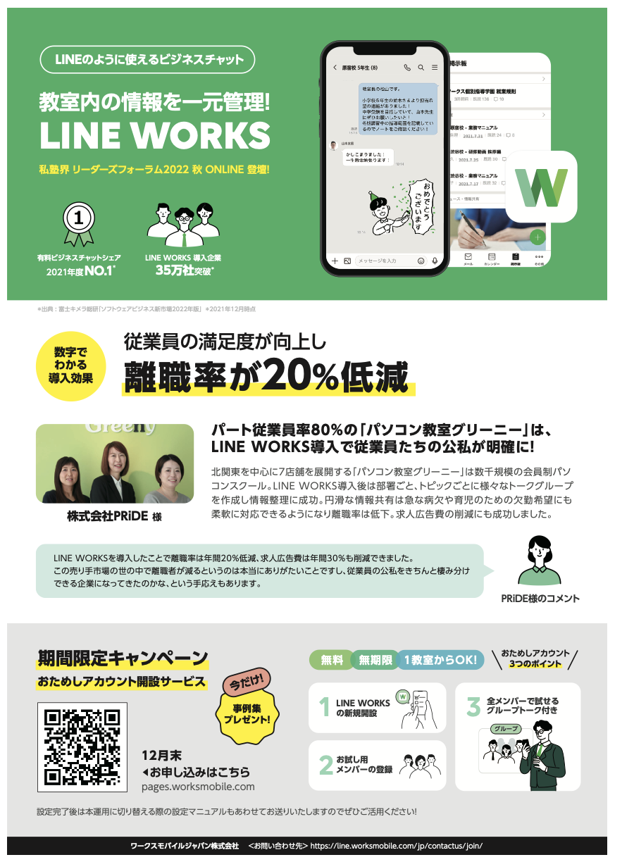 個別指導塾や習い事教室での活用取材を収録。教室運営における情報共有の課題とLINE WORKSでどのように解決か必見です。