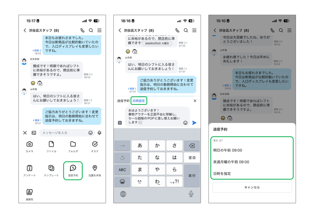 トークルームの送信画面から簡単に送信時間を設定でき、送信前であれば予約の変更や削除も可能です。