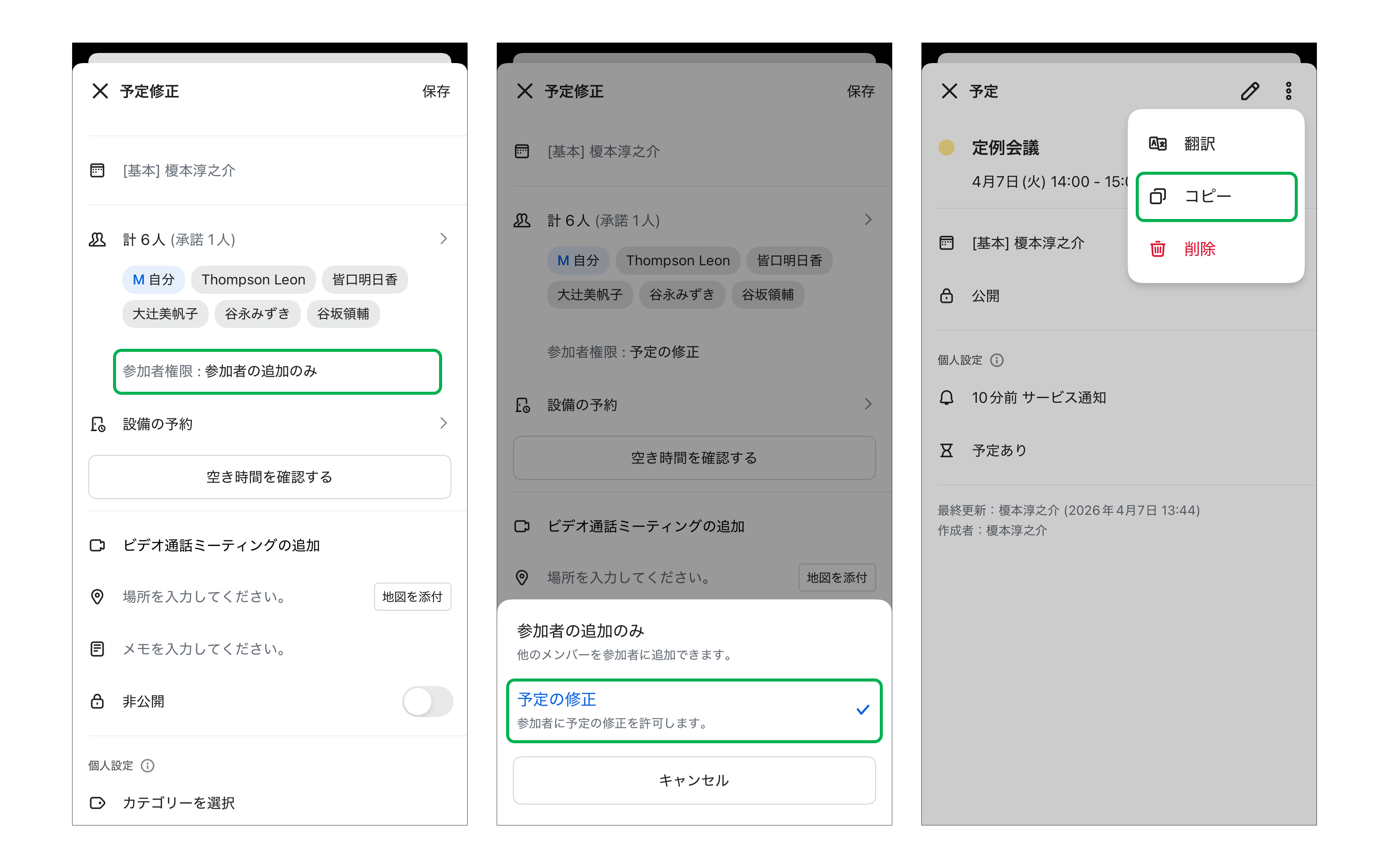 予定作成者以外の参加者に、予定の修正権限を設定できるようになりました。