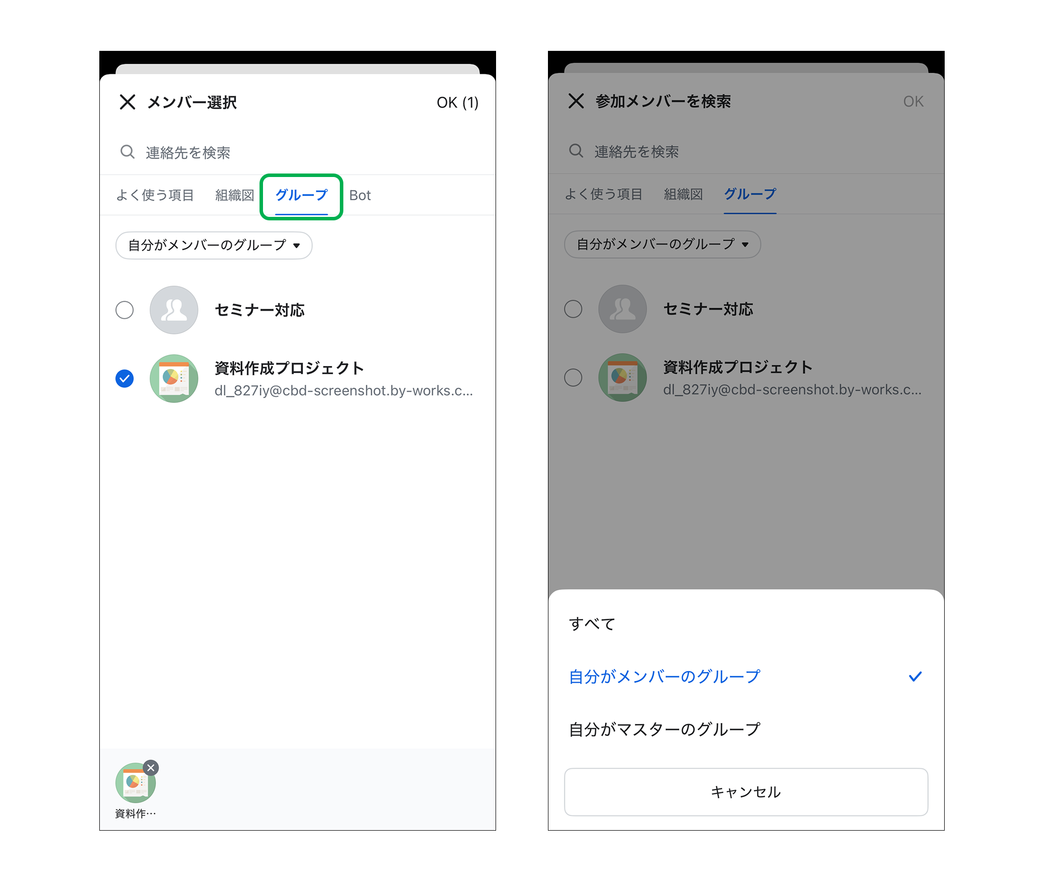 トークルーム作成時や予定作成時のメンバー選択画面に、「グループ」タブを追加しました!