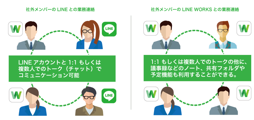 外部企業の担当者もLINE WORKSを利用している場合も同様に、友だち登録をすることでやり取りが可能になります。LINE WORKS同士の場合、グループ機能を使って、議事録やメモなどをノートで共有したり、ファイルをフォルダで管理したり、予定も共有できるので、情報共有の効率が向上します。