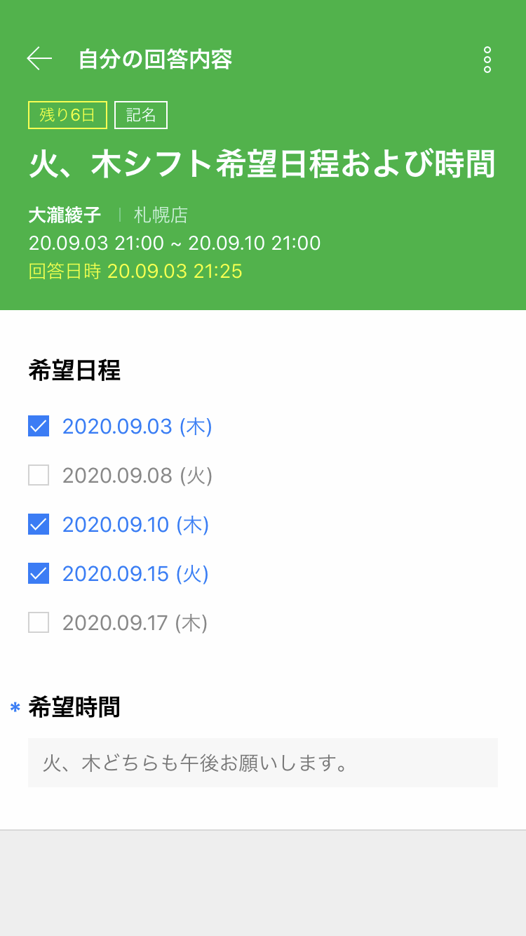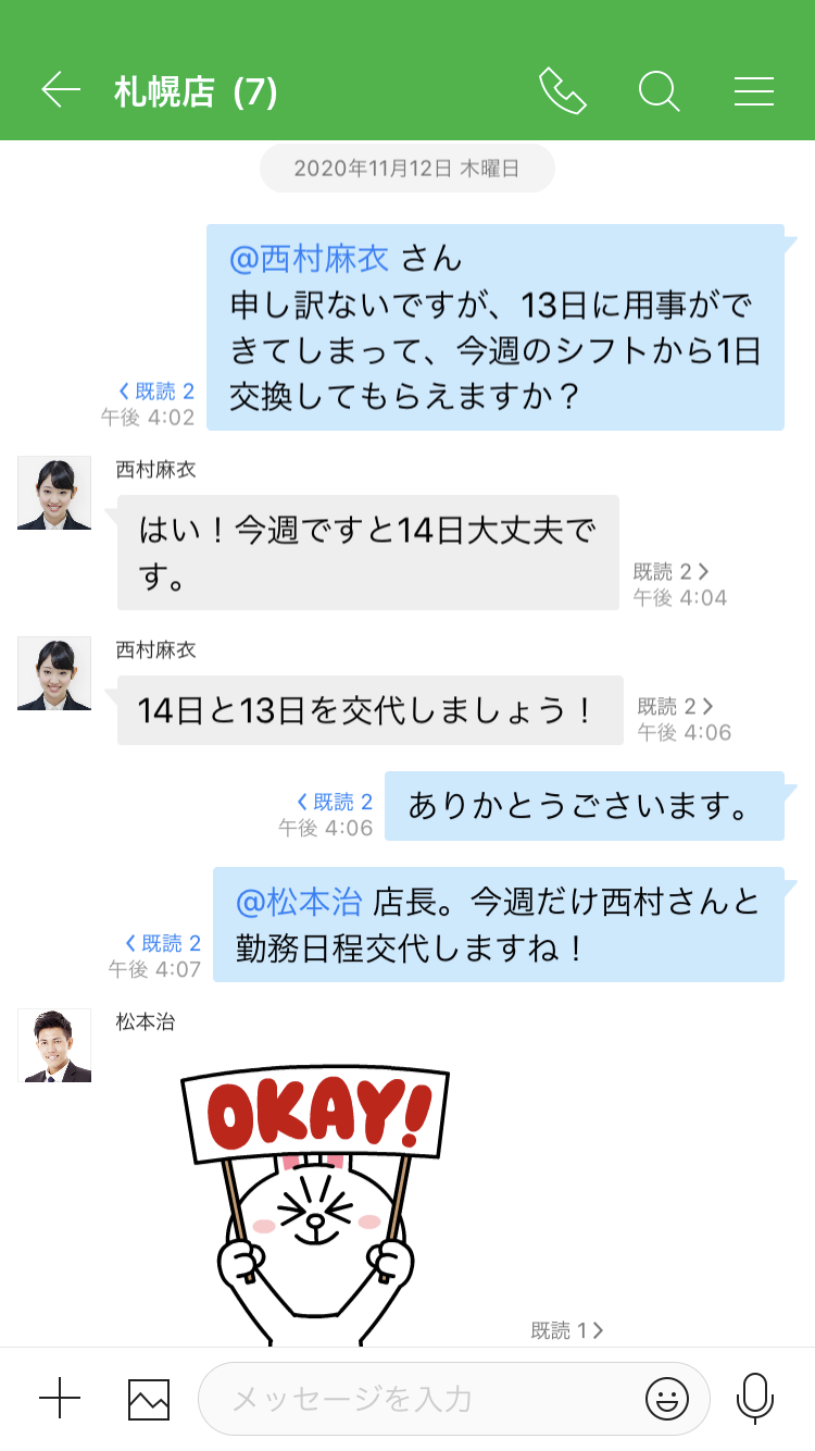 LINE WORKS 賢くシフト管理する方法 2020.09.11 従業員の勤務希望時間を取りまとめて調整する作業には非常に手間と時間がかかります。 LINE WORKS で勤務日程を管理し、引き継ぎ書を共有してみてください。 効率的なシフト管理で最適な職員管理ができるので、店舗サービスのクオリティが向上します。 スケジュール管理ツールとしての LINE WORKS の特徴 細かな業務の変更もスマホですぐに修正できます。 従業員の勤務希望時間を簡単に集計できます。 直接会わなくても LINE WORKS で共有して引継ぎができます。 1. モバイルアプリひとつで予定管理 共有カレンダーやエクセルなど、複数のツールを使用しなくても LINE WORKS だけで一日の業務を管理できます。 LINE WORKS カレンダーに勤務日程を登録するとスマホでいつでも確認できるので、印刷したり確認のために移動する必要がありません。 予定の確認する方法はこちら > 1日の勤務日程 2. 勤務希望日をアンケートで集計 勤務希望時間の確認には時間がかかり、未回答者への連絡や集計にも手間がかかります。 LINE WORKS では勤務希望時間のアンケートを一斉配信し、集計結果も一目で把握できます。 またアンケートの回答者を確認し、未回答者に再通知することもできます。 アンケート利用ガイド見る > 勤務希望アンケート アンケート回答者の確認 3. 引継ぎ書も簡単に共有 業務に必要なマニュアルやデータを LINE WORKS Drive を使って別のシフトのスタッフに確実に引き継ぎましょう。 商品カタログ、当日の販売状況などを記録して Drive にアップロードすることができます。 また、顧客応対や業務の処理方法など、新入スタッフのためのマニュアルを投稿しておくことで、必要時にすぐに確認できます。 動画、ファイルを Drive にアップロードする方法はこちら > 共有フォルダ内のマニュアル 4. 勤務時間を素早く調整する 従業員同士でシフトを交代したり、追加勤務が必要な時はトークで素早く伝えましょう。 トークは記録に残るので、より正確に調整し、日程が変更されたらそのままカレンダーに登録できるので、 手間をかけずに共有できます。 メンバーの予定を確認する方法はこちら > 従業員同士のシフト調整 変更した勤務時間をすぐにカレンダーに反映 賢くスケジュール管理する秘訣は「LINE WORKS」にあります。 LINE WORKS 活用事例 ※ 本掲載記事の内容は投稿当時の情報となり、2022年4月1日に改定された新料金プランとは一部異なる内容を含む場合があります。