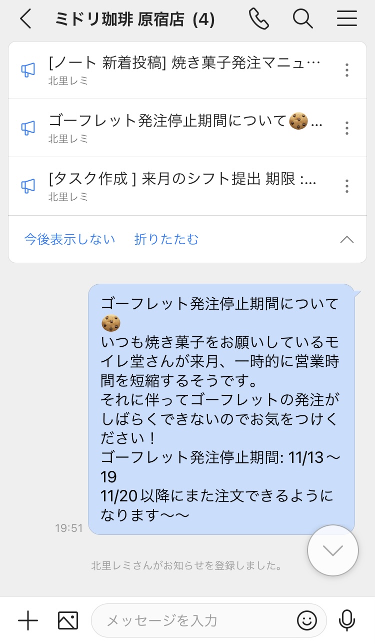 ※ v3.8 以上のアプリにアップデートもしくは新規インストールした環境では、既存の「ノートのお知らせ」がトークルーム上部に表示されなくなります。必要な場合には、あらためて「ノートの投稿お知らせ通知」をトークルームのお知らせとして登録してください。
