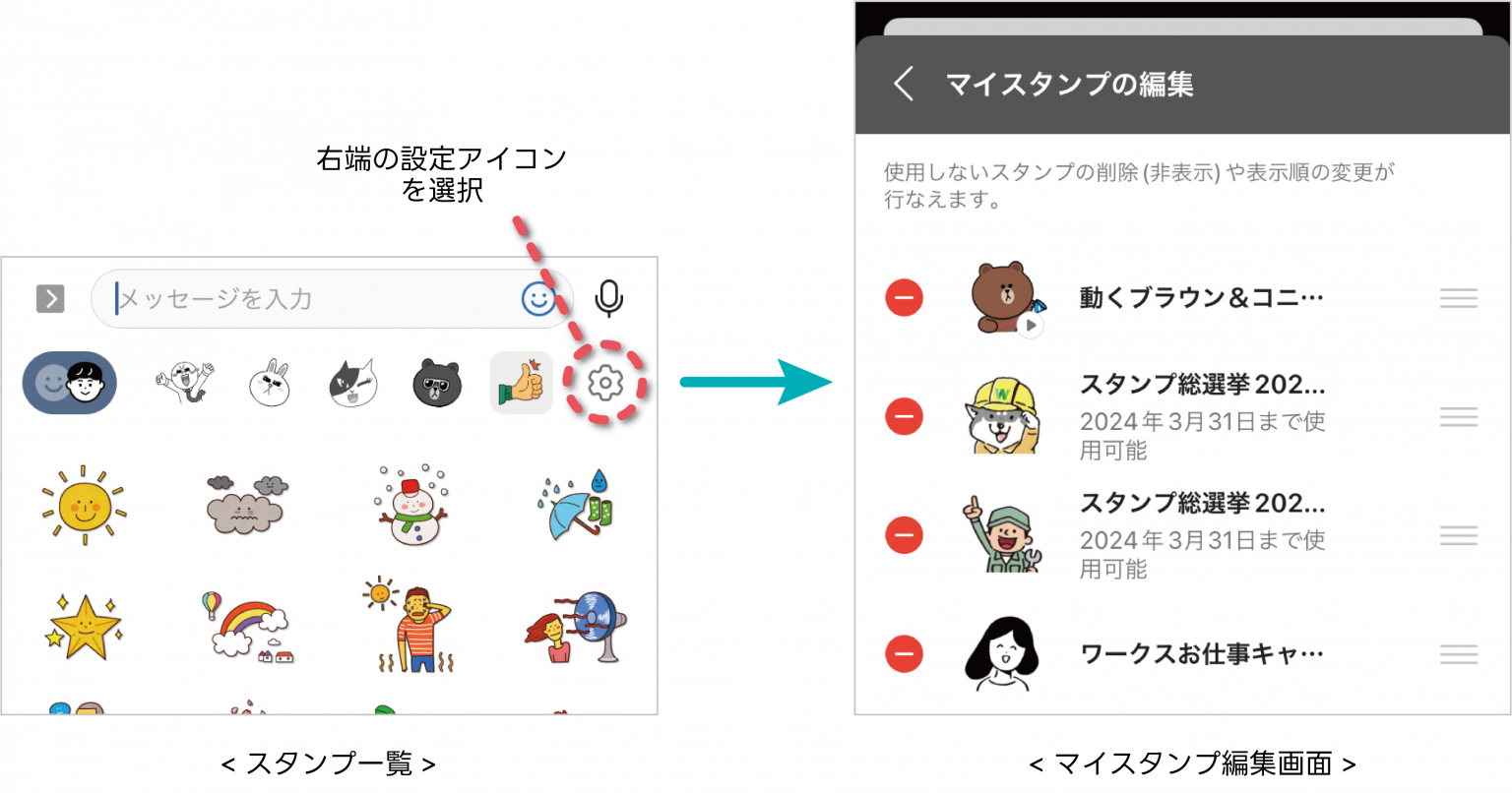 スタンプ一覧に表示されるスタンプの種類や並び順を自分好みにカスタマイズできるようになりました。