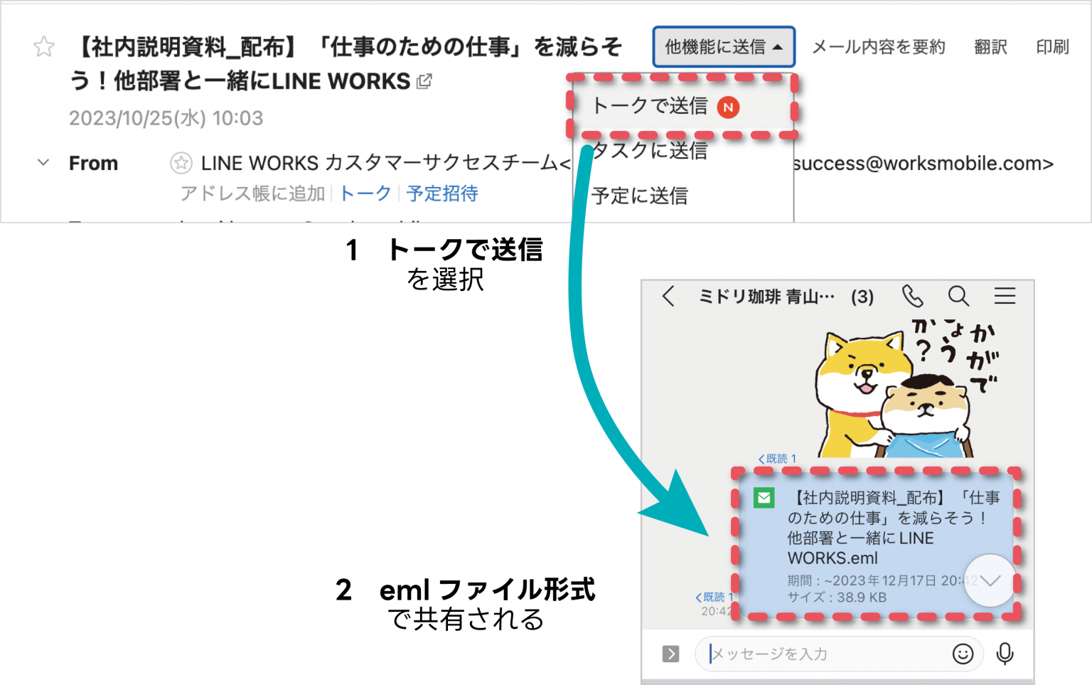 また、モバイル版でもメールに添付されたファイルをダウンロードせず直接トークルームに共有できるようになりました。