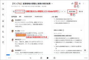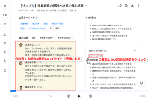 作成したメモのタイムスタンプをクリックすれば、すぐに元の発言箇所に戻って音声を確認できます。これにより、情報の裏取りも簡単に行えます。