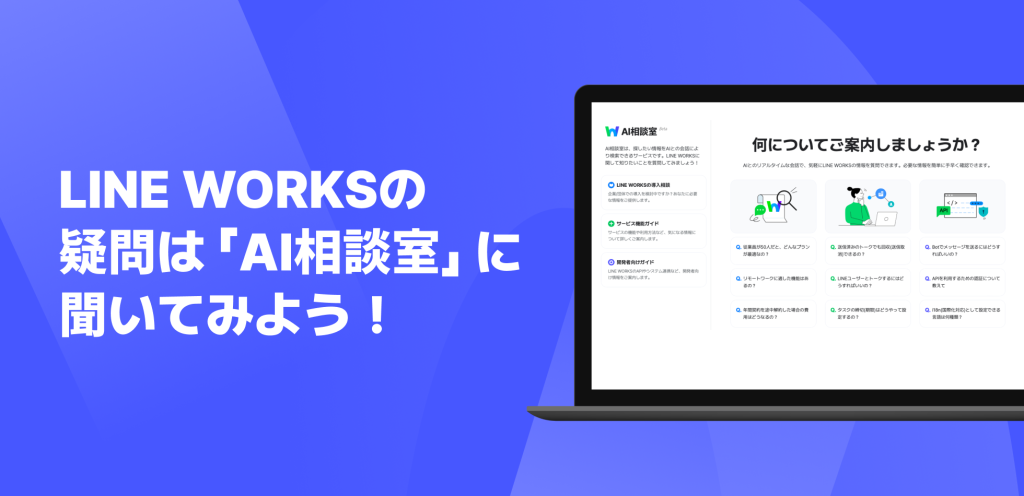「AI相談室」は、LINE WORKS に関連した質問に答えてくれるチャットボットです。