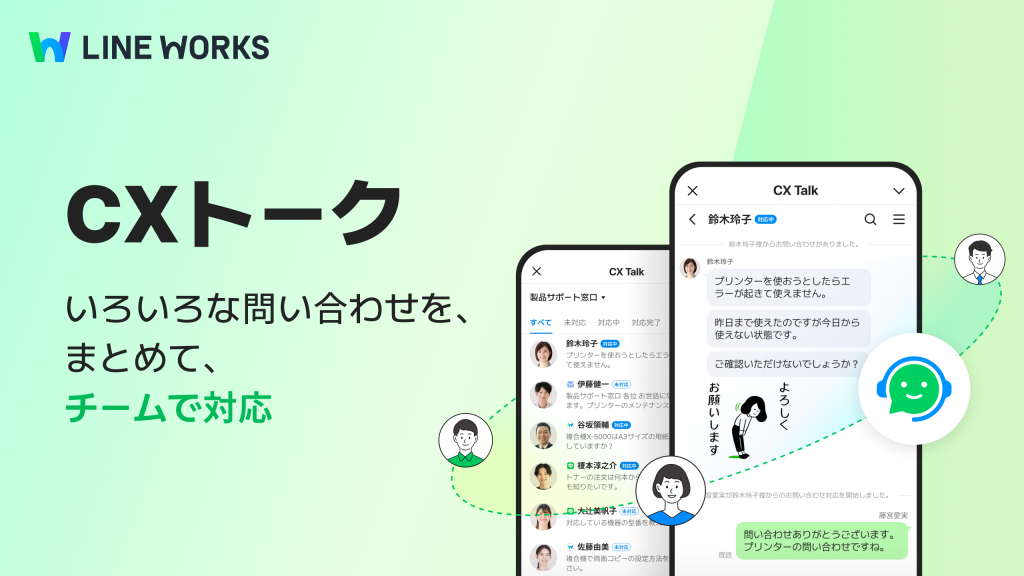 「CXトーク」は、2025 年 6 月に誕生した、いろいろな問い合わせを、まとめて、チームで対応できる、LINE WORKS の新しいオプション商品です!