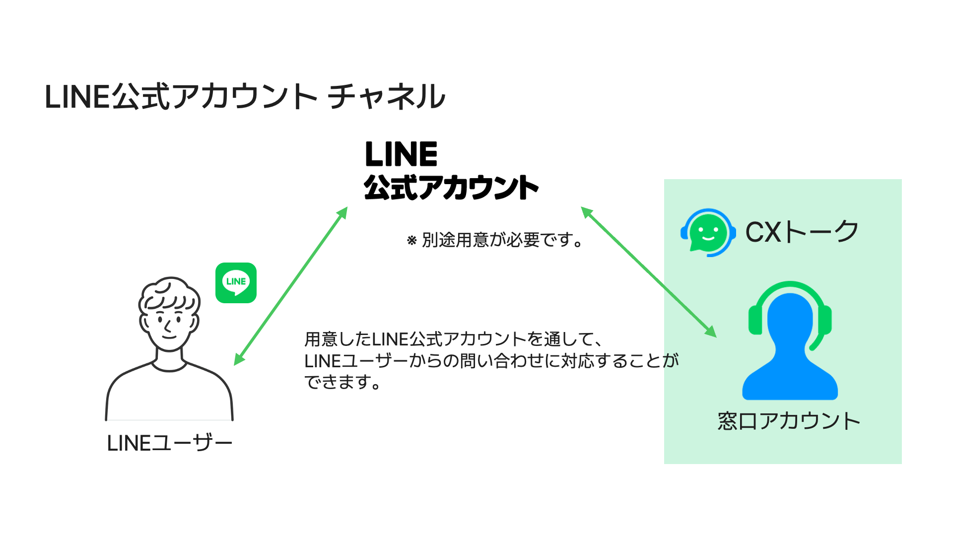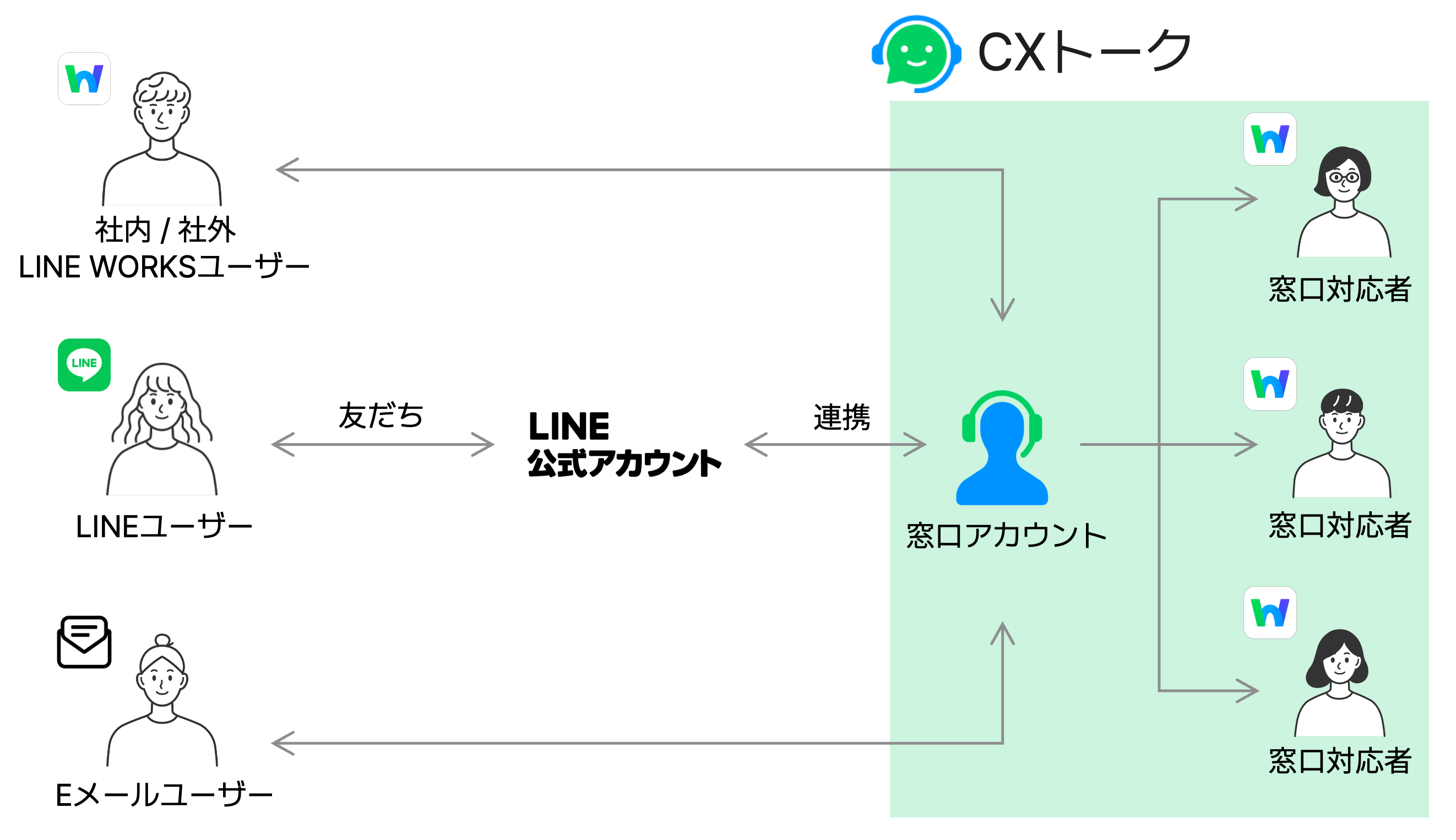 「CXトーク」は複数の窓口アカウントによって構成されます。窓⼝アカウントはお客様の問い合わせ先となる仮想的なアカウントであり、「窓⼝対応者」として参加しているメンバーがその窓⼝アカウントを介して問い合わせのやり取りを⾏います。