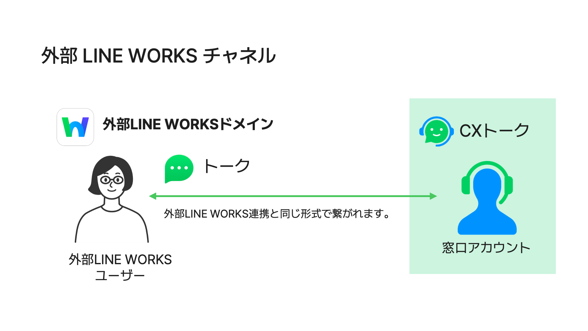 外部の LINE WORKS ユーザーから問い合わせを受け付けるチャネルです。社外の LINE WORKS ユーザーからの問い合わせ対応にお使いいただけます。