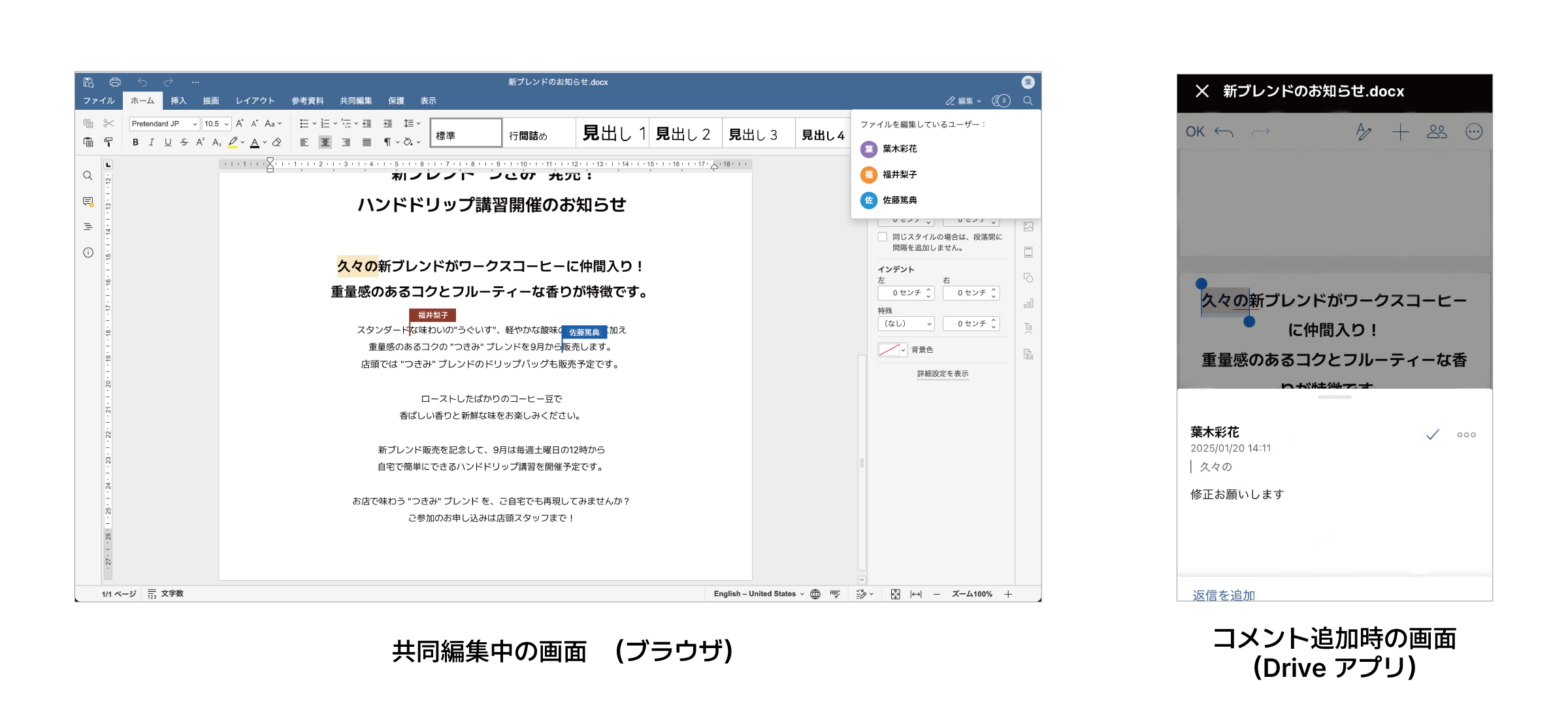 また、Drive専用アプリを使えばスマートフォンやタブレット端末からもファイルの編集が可能です。外出先で急いでいるときでも、手早くファイルを修正したりコメントを追加することができます。
