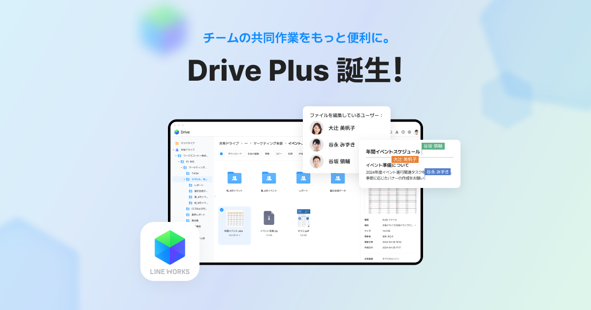 そして、共同編集には社外の人も参加可能です。Drive Plusを利用中の人から共有されたファイルは、通常のDriveを利用している人や、LINE WORKSのアカウントを持っていない人であっても一緒に編集することができます。