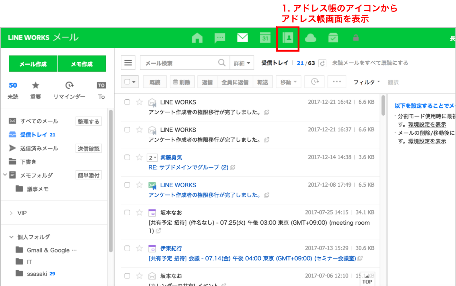 1. LINE WORKSのブラウザ版Myサービスにログインし、上のメニューのアイコンから「アドレス帳」の画面を開きます。