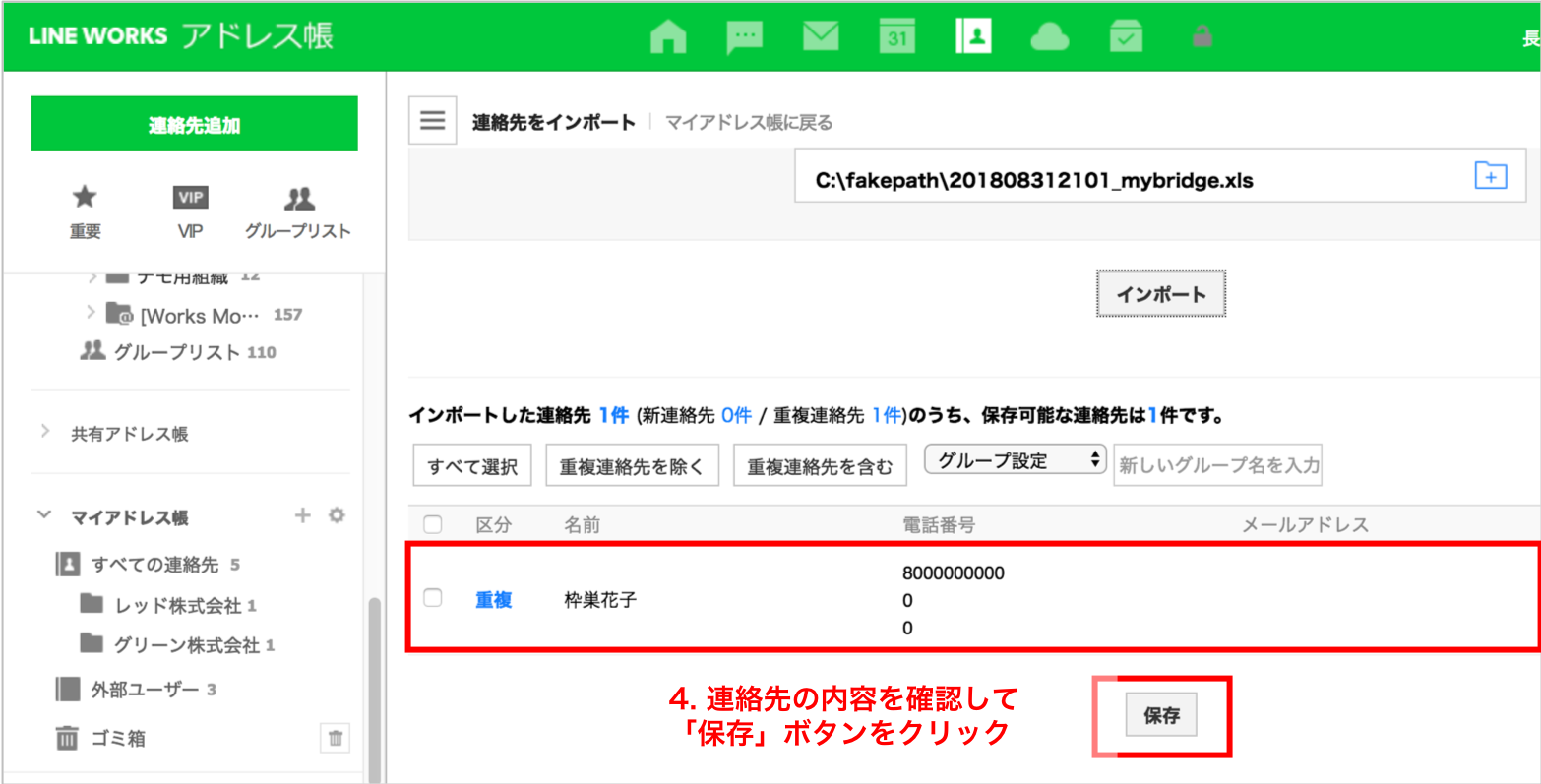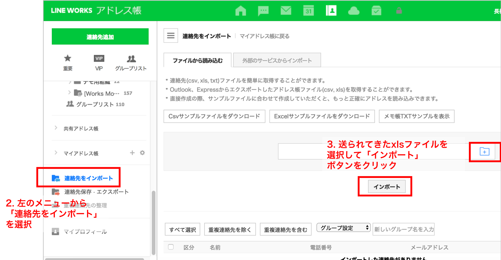 STEP2. xlsファイルをLINE WORKSのアドレス帳にインポートする