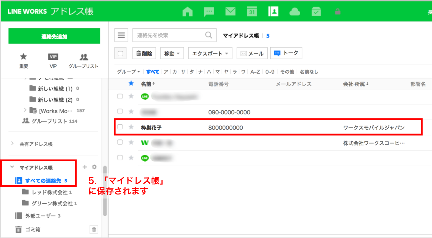5. 取り込んだ連絡先情報は、「マイアドレス帳」に保存されます。「マイアドレス帳」は、自分だけが見られるアドレス帳です。LINE WORKSのアプリ側でも自動的に同期されます。