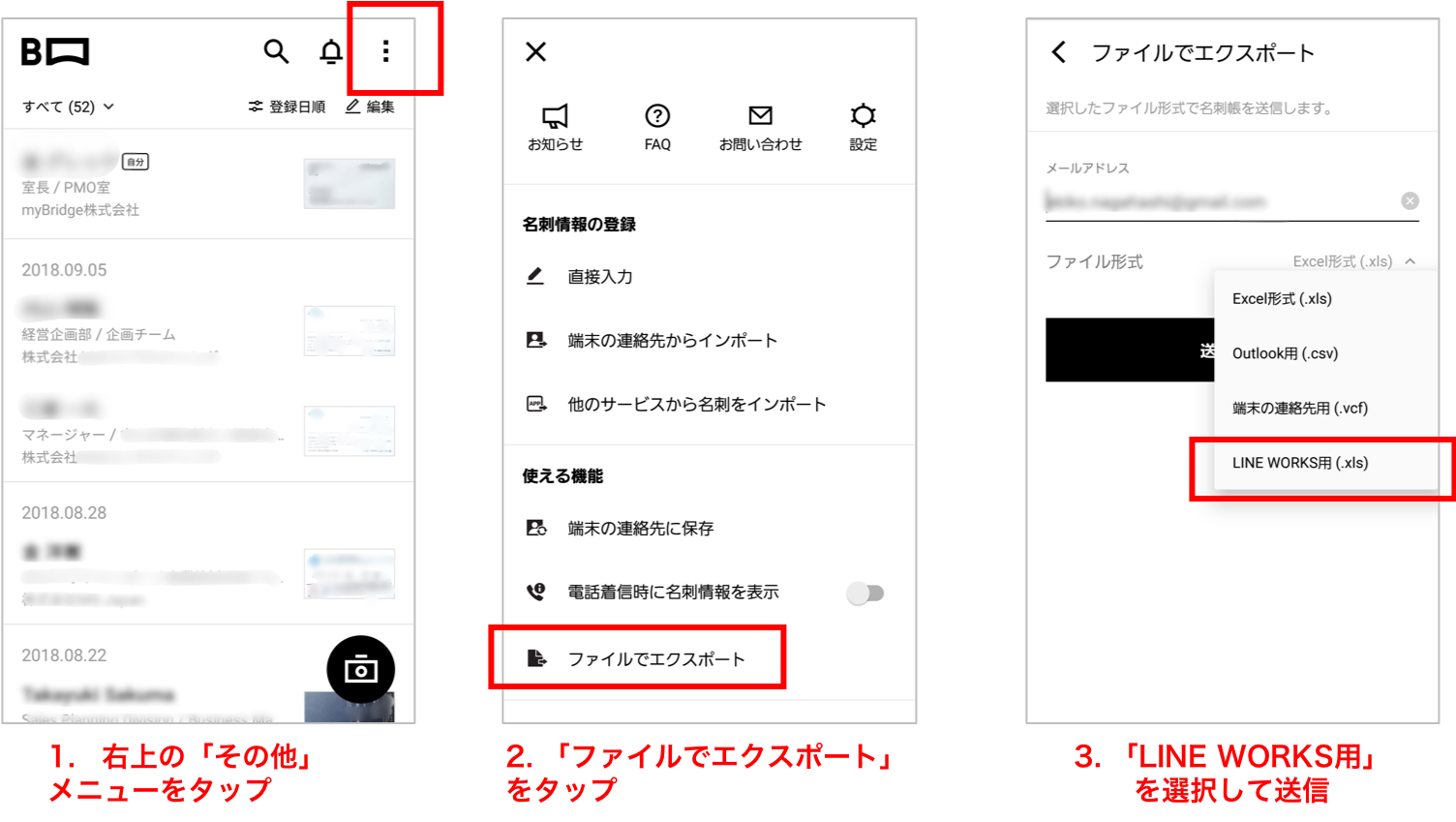 3. メールアドレスを入力し、「ファイル形式」をタップし、「LINE WORKS用(.xls)」を選択します。入力されたメールアドレスに、エクスポートされた名刺データのxlsファイルが送られます。添付ファイルをPCのドライブに保存してください。