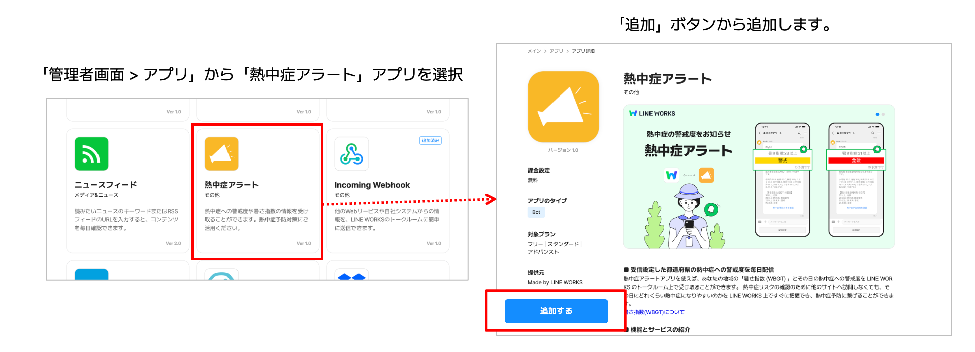 1. まず、管理者画面から「熱中症アラート」アプリを追加します。